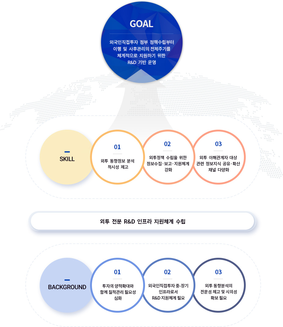 외국인직접투자 정부 정책 수립부터 이행 및 사후관리의 전체주기를 체계적으로 지원하기 위한 R&D 기반의 운영을 목적으로
